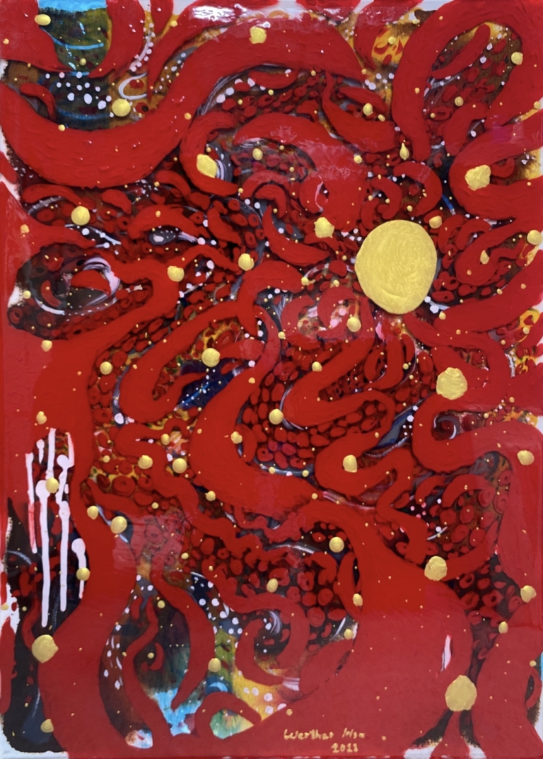 2025 複合媒材 33 x 24 cm 創作理念 這幅作品以紅色和粉紅色的圓形圖案為主,象徵紅血球的形態。畫面中央…